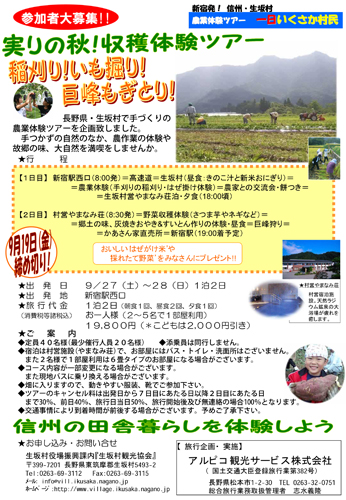 27日と28日は関東地域にお住まいの方を対象に、生坂村(東筑摩郡)が提供して「稲刈り・芋掘り等の野菜の収穫体験、また名産の山清路巨峰の捥ぎ取りを体験」をする一泊二日の農業体験「一日いくさか村民」ツアー